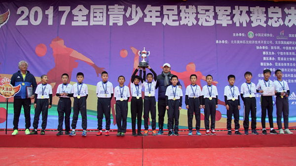 12月17日下午,由中国足球协会、国家奥林匹克体育中心主办,北京奥林匹克经济技术开发公司、北京国奥越野足球俱乐部有限公司共同承办,由北京国奥之星体育文化发展有限公司作为推广单位的“2017年全国青少年足球冠军杯赛”总决赛圆满落下帷幕。闭幕仪式上,34支参赛队、总决赛专家组、裁判组齐聚霞浦一中,为2017年赛程画上完美句点。 中共霞浦县委常委、县总工会主席徐菁,霞浦县人民政府副县长于洋,中国足球协会青少部吴子乐,冠军杯赛组委会赛事运营总监王文宜,福建省足协副主席、宁德市足协主席唐文彬以及冠军杯总决赛专家组、裁判组与近600名运动员、教练员共同出席了本次总决赛闭幕仪式,并为获奖小球员、教练员和裁判员颁奖。 2017年全国青少年足球冠军杯赛历经六站进入总决赛的34支队伍,完成了91场激烈的赛事比拼,各球队奖项均已出炉。其中,U11男子组由大连队摘得桂冠,亚军、季军分别为延边队与广州队。U11女子组由江苏队摘得桂冠,亚军、季军分别为上海队与北京队。U12男子组冠军为新疆队,亚军、季军分别为广东队与河南队。U12女子组冠军为上海队,亚军、季军分别为青岛队与江苏队。还评选出U11、U12男女组别的希望之星、玫瑰之星、最佳阵容、最佳球员、最佳射手、最佳守门员、团体一二等奖、优秀教练员以及优秀裁判员等奖项。 闭幕式尾声,中共霞浦县委常委、县总工会主席徐菁上台致闭幕词并宣布2017年全国青少年足球冠军杯赛总决赛圆满落幕,徐菁代表霞浦县委、县政府以及赛事组委会对本次比赛的成功举办和本次获奖参赛单位及运动员表示热烈祝贺,并向为本次比赛提供优质专业服务的裁判员和工作人员表示衷心的感谢。 2017年全国青少年足球冠军杯赛的成功举办得到了七个赛区举办地包头、西安、滨州、莱西、永州、玉溪、霞浦地方政府的支持,也得到了阿迪达斯、“小牛在线”、阿尔山矿泉、福驰体育、常佰通饮品、茵浪体育等赞助企业以及赛区承办单位闽东体育的帮助和支持。 通过各方的支持、帮助和配合,2017年全国青少年足球冠军杯赛完满落幕,通过本次总决赛5天的比赛时间,这些少年们用他们的拼搏、激情与汗水,切磋技艺、加深友谊、浇灌梦想,他们顶着阴雨,用顽强、拼搏、团结、自信的表现诠释了“阳光体育,快乐足球”的精神。 全国青少年足球冠军杯赛作为目前我国U11、U12年龄组最权威、最专业、最有影响力的全国青少年足球赛事,旨在促进中国青少年足球的蓬勃发展,将培养出更多优秀的足球后备力量。